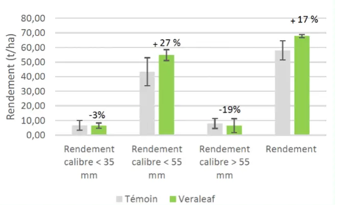 Cette double application à favorisé l’augmentation du rendement global de 9,83 t/ha soit une amélioration de 17% et particulièrement le rendement commercialisable du calibre (35-55mm) de +27% apportant un réel bénéfice pour le producteur.